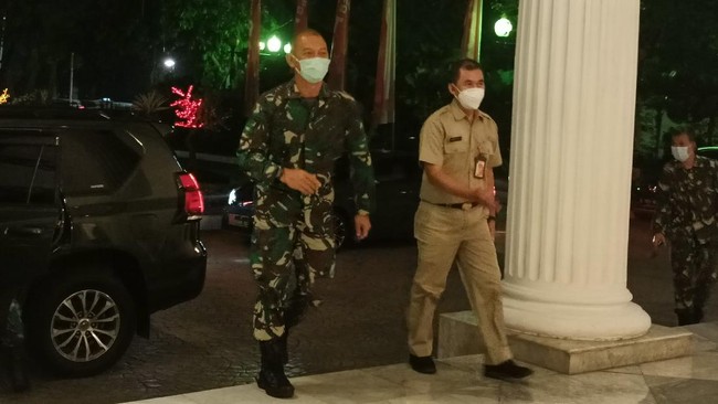 Pantauan detikcom di lokasi, pukul 19.00 WIB, Pangdam Jaya Mayjen TNI Mulyo Aji tiba lebih dulu di kantor Balai Kota DKI Jakarta, Jalan Medan Merdeka Selatan, Jakarta Pusat, Senin (14/6/2021). Dia terlihat memakai seragam lengkap TNI dan langsung memasuki kantor tersebut.