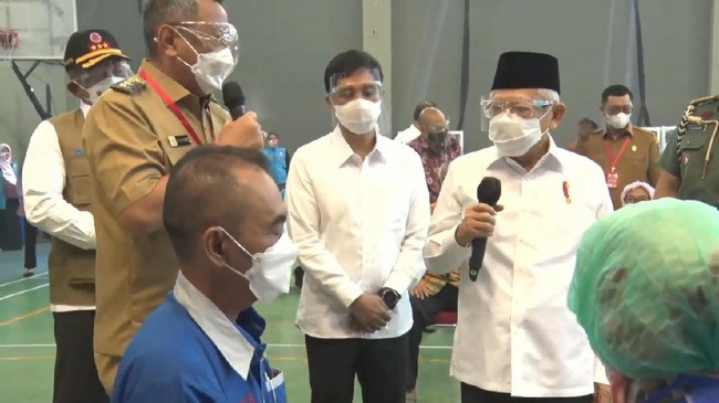 Wakil Presiden Ma'ruf Amin meninjau vaksinasi Covid-19 masal di Sport Center Tangerang Selatan (Tangsel), Banten. Ma'ruf Amin meminta vaksinasi dipercepat, sebab saat ini kasus Corona mengalami peningkatan.