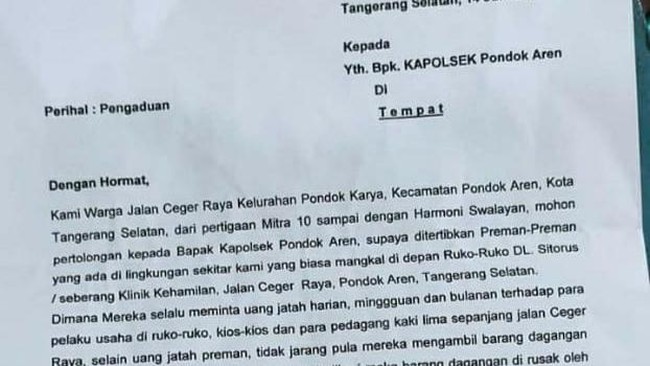Surat tersebut ditujukan oleh warga ke Kapolsek Pondok Aren. Warga meminta agar polisi melakukan penindakan terhadap para preman tersebut.
