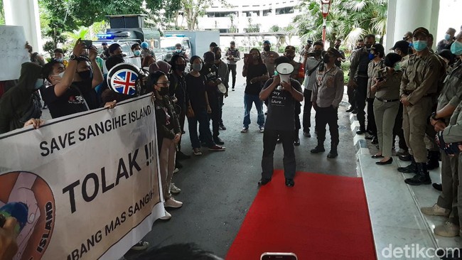 Pantauan detikcom di kantor Gubernur Sulut, massa aksi mulai datang melakukan unjuk rasa sejak pukul 11.45 Wita. Selanjutnya pada pukul 12.39, mereka secara bergantian melakukan orasi menuntut Pemprov Sulut mencabut izin tambang emas PT TMS di Kabupaten Kepulauan Sangihe.