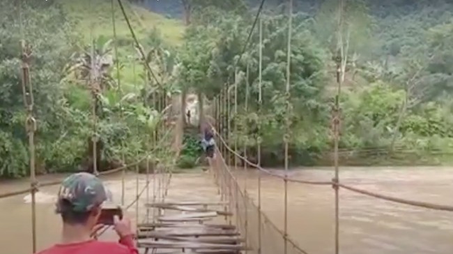 Dalam video viral berdurasi 2 menit 22 detik, tampak beberapa pelajar wanita bergelantungan pada seutas tali jembatan gantung yang sudah rusak. Dia kemudian berjalan di atas tali itu untuk menyeberangi sungai yang berada 10 meter di bawah jembatan itu.