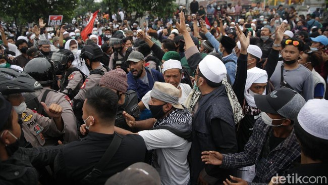 Massa pendukung Habib Rizieq Shihab (HRS) menggelar aksi pada sidang vonis terkait kasus tes swab RS Ummi, Bogor, Jawa Barat. Bahkan aksi dari mereka diwarnai kericuhan di luar Pengadilan Negeri Jakarta Timur (PN Jaktim) hingga polisi menembakkan gas air mata.