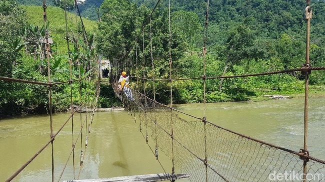 Kendati takut saat melintasi jembatan gantung ini, Nurhikmah mengaku tidak dapat berbuat apa-apa. Sebab, tidak ada jalan lain.