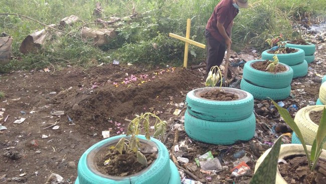 Sekarang, lokasi bekas tumpukan sampah sudah diubah menjadi taman. Sejumlah ban warna warni disusun rapi sebagai pot bunga. Ada pula satu tumpukan tanah berbentuk kuburan.