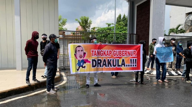 Tidak hanya foto karikatur, dalam spanduk itu juga tertulis 'Tangkap Gubernur Drakula' yang dibentangkan di depan pintu masuk Kejaksaan Tinggi Riau, Rabu (2/6). Gambar dan tulisan di spanduk itulah yang kemudian diadukan Syamsuar ke polisi.