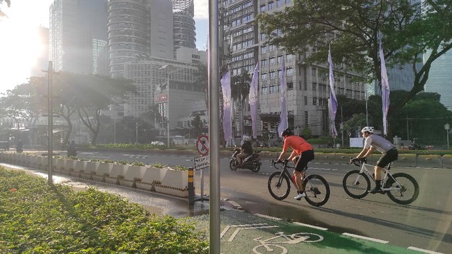 Pantauan detikcom, pukul 07.10 WIB, Sabtu (26/6/2021), para pesepeda sudah meramaikan jalur sepeda Sudirman-Thamrin tepatnya di depan gedung FX Sudirman. Mereka terlihat menggunakan masker demi mentaati protokol kesehatan (prokes).
