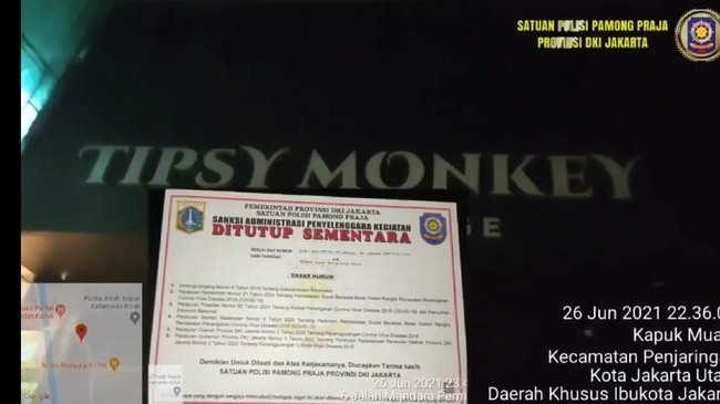 Penindakan Tipsy Monkey ini diunggah lewat akun @satpolpp.dki. Dilihat, Minggu (27/6/2021), modus kafe ini beroperasi dengan mematikan lampu dan mengunci pintu depan.