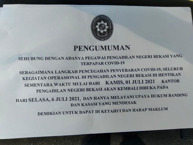"Pengumuman. Sehubungan dengan adanya pegawai Pengadilan Negeri Bekasi yang terpapar Covid-19 sebagaimana langkah pencegahan penyebaran Covid-19, seluruh kegiatan operasional di Pengadilan Negeri Bekasi dihentikan sementara waktu mulai hari Kamis 1 Juli 2021. Kantor Pengadilan Negeri Bekasi akan kembali dibuka pada hari Selasa 6 Juli 2021 dan hanya melayani upaya hukum banding dan kasasi yang mendesak demikian dapat diketahui dan harap maklum," bunyi edaran tersebut.