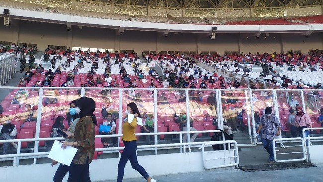Pantauan detikcom, Sabtu (3/7/2021) pukul 07.40 WIB, peserta vaksinasi usia 12 tahun ke atas mulai berdatangan ke GBK. Area masuk ring dalam GBK terlihat dibatasi hanya untuk kegiatan vaksinasi. Para peserta masuk lewat Gerbang F.