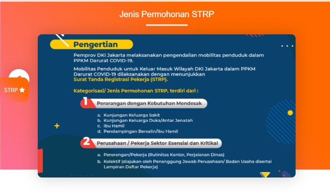 Pemprov DKI Jakarta mensyaratkan Surat Tanda Registrasi Pekerja (STRP) untuk pekerja yang akan keluar-masuk Jakarta selama PPKM Darurat. Namun proses pembuatan STRP itu dikeluhkan banyak pihak.