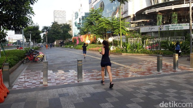 Pantauan detikcom, Minggu (11/7/2021) tepatnya di depan Mal fX Sudirman, Jalan Jenderal Sudirman, Jakarta Pusat pukul 07.15 WIB, terlihat segelintir warga berolahraga. Mereka tampak sedang jogging dan bersepeda di sepanjang area trotoar.