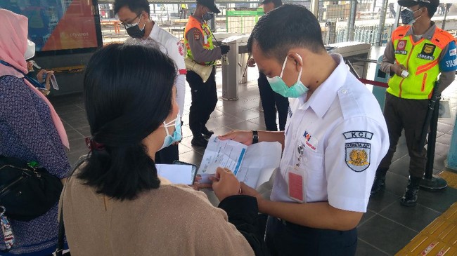 Pantauan detikcom, Senin (12/7/2021), pukul 07.20 WIB, pekerja yang hendak menggunakan KRL dicek terlebih dahulu apakah membawa STRP atau tidak sebelum masuk ke dalam stasiun. Sekitar lima petugas tampak bersiaga.