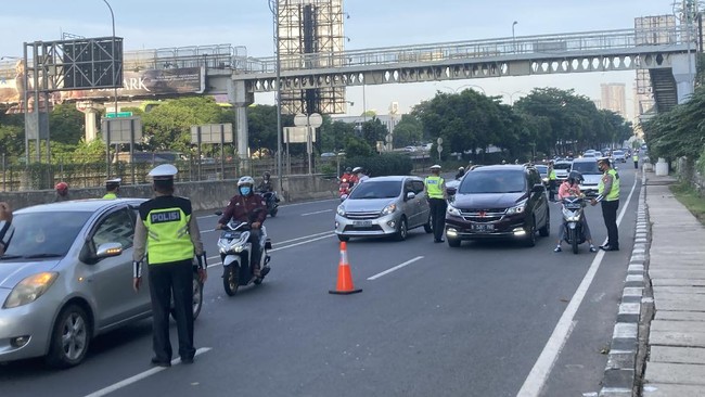 Secara bergantian, petugas tampak memeriksa kelengkapan surat pengendara. Ada pula yang memberi akses jalan bagi pengendara yang dapat melintas di kawasan ini.