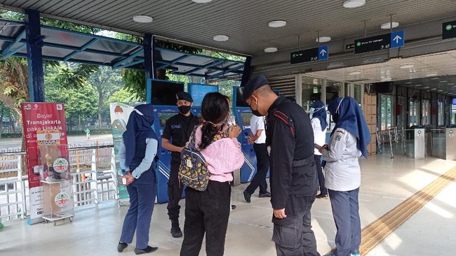 Pantauan detikcom di Halte TransJakarta Ragunan, Jakarta Selatan, pukul 07.07 WIB, Selasa (13/7/2021), terlihat ada petugas dari TransJakarta dan Dinas Perhubungan yang mengecek STRP di pintu utama halte sebelum penumpang menempelkan kartu. Para petugas itu meminta calon penumpang menunjukkan STRP sebagai syarat melakukan perjalanan.