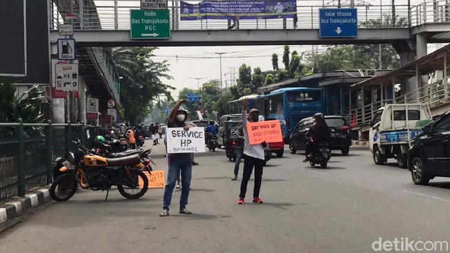 Pantauan detikcom di depan PGC, tepatnya di seberang Halte TransJakarta PGC 1, di Jalan Mayjen Sutoyo, Jakarta Timur, pada Rabu (14/7/2021), sekitar pukul 12.00 WIB, sejumlah tukang servis HP tampak mulai turun ke pinggir jalan. Mereka tampak berdiri di pinggir jalan sambil memegang Styrofoam putih bertulisan 'Service HP Bisa Ditunggu'.