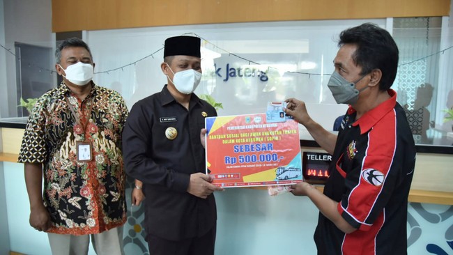 Bansos diberikan lantaran usaha masyarakat banyak yang terpaksa harus tutup, sehingga mereka tak bekerja. Kali ini, bansos diberikan untuk para sopir angkot, kernet dan juru parkir yang ada di Kota Kebumen. Bantuan uang tunai sebesar Rp 500 ribu per orang ini diberikan langsung oleh Bupati Kebumen Arif Sugiyanto di Bank Jateng Kebumen.