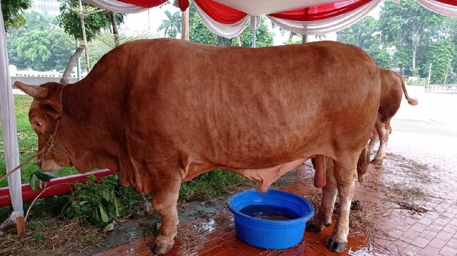 Pantauan detikcom pada Selasa (20/7/2021) pukul 12.00 WIB di pintu Al-Ghaffar Masjid Istiqlal, Jakarta Pusat, sapi tersebut ditambatkan di tenda di depan pintu VVIP Masjid Istiqlal, Jakarta Pusat. Ada dua sapi di lokasi ini.