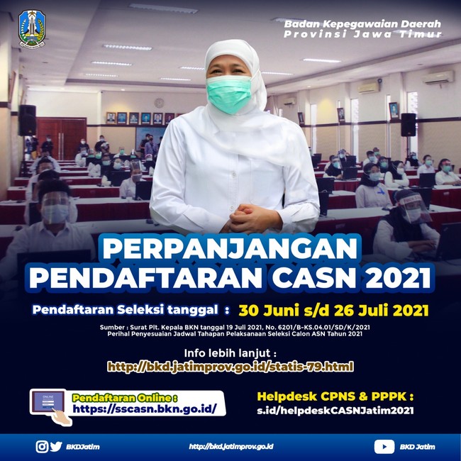 Pendaftaran seleksi Calon Aparatur Sipil Negara (CASN) diperpanjang hingga 26 Juli, dari jadwal yang ditetapkan semula tanggal 21 Juli 2021. Perpanjangan ini mendapatkan sambutan dari Gubernur Jawa Timur, Khofifah Indar Parawansa.