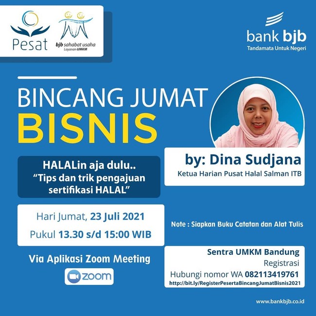Bagaimana proses untuk mendapatkan sertifikasi tersebut? Langkah-langkah apa saja yang perlu dipersiapkan oleh para pelaku usaha? Melalui acara webinar Bicang Jumat Bisnis bjb, bahasan tersebut akan dikupas tuntas bersama narasumber Ketua Harian Pusat Halal Salman ITB, Dina Sudjana.