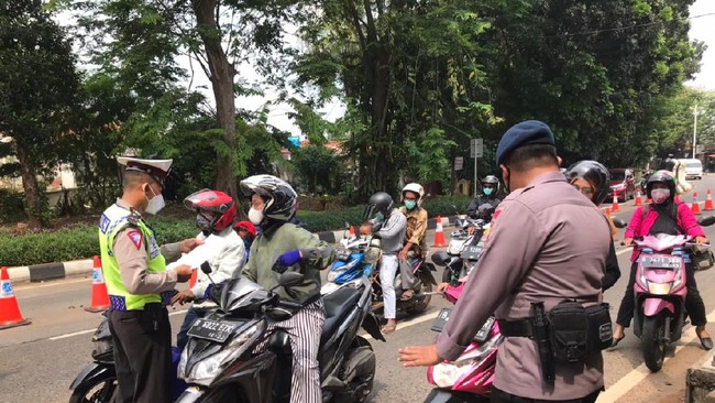 Penyekatan di Jalan Lenteng Agung, Jagakarsa, Jakarta Selatan, masih terus dilakukan. Polisi menyebut jumlah pengendara yang melintasi titik penyekatan hari ini menurun.