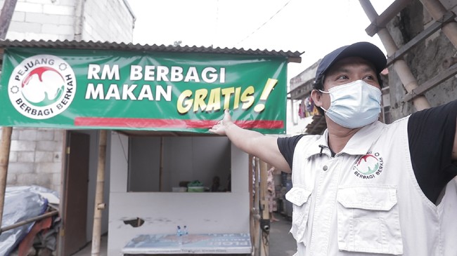Warga silih berganti mendatangi rumah makan gratis di salah satu pojok padatnya wilayah Semanan, Kalideres, Jakarta Barat. Ada yang menikmati makan di tempat, ada juga yang membawanya pulang untuk makan di rumah. Bagi warga yang tidak menggunakan masker pun tetap dipersilahkan masuk setelah dibagikan masker.