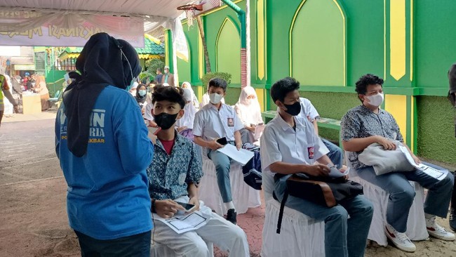 Pantauan detikcom pukul 10.55 WIB, di lokasi terlihat siswa/siswi dengan seragam lengkap mendatangi gerai vaksin. Bahkan anak-anak tersebut terlihat juga ada yang memakai sepatu, selayaknya pergi ke sekolah.