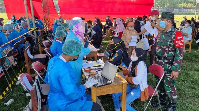 Babinsa TNI dan Bhabinkamtibmas tampak aktif membantu warga mengikuti alur vaksinasi yang sudah disiapkan. Lewat pengeras suara, mereka juga mengimbau warga menerapkan protokol kesehatan, di antaranya dengan menjaga jarak dan selalu mengenakan masker.