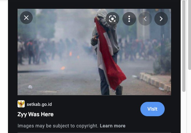 Namun di Google, muncul gambar dari situs Setkab berupa foto Lutfi pembawa bendera. Tampilan situs Setkab disertai tulisan 'Zyy Was Here'.