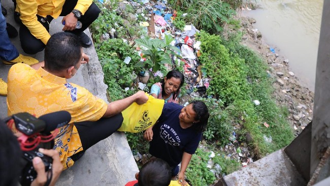 Ijeck mendapati warga tinggal di kolong jembatan ini saat membagikan bantuan dari Partai Golkar Sumut kepada warga yang terdampak PPKM level 4 di Medan, Jumat (30/7). Ijeck merupakan Ketua Golkar Sumut.