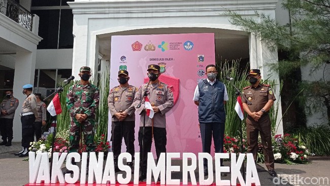 "Di mana vaksinasi merdeka ini adalah strategi vaksinasi yang akan dilaksanakan untuk merayakan Hari Kemerdekaan kita, 17 Agustus di mana dengan strategi ini, maka di tanggal 17 Agustus, upaya dari Kapolda bersama dengan Pak Gubernur dan Pak Pangdam dengan didukung oleh relawan-relawan yang bergabung dari beberapa kelompok, komunitas, ada ikatan dokter, ada dari mahasiswa kemudian ada akademisi yang lain," kata Sigit dalam acara 'Launching Gerakan Vaksinasi Merdeka" di Polda Metro Jaya, Jakarta, Minggu (1/8/2021).
