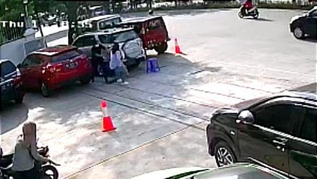 H, yang mengenakan jilbab hitam dan baju kemeja biru, lantas mendekati korban saat membuka pintu mobilnya. H lalu cekcok dengan R.