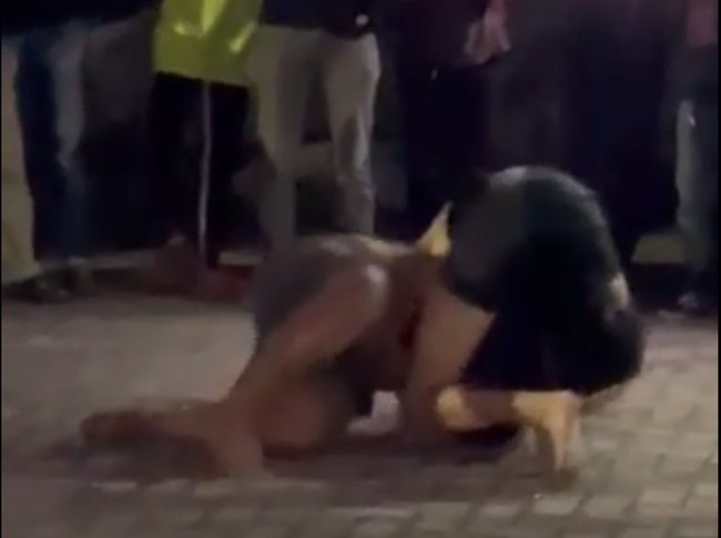 Dalam video yang viral, tampak seorang wasit menggunakan jaket dan berpenutup wajah memberi aba-aba kepada 2 pria yang bertarung bebas. Kedua pria itu kemudian tampak bergulat dan saling banting.
