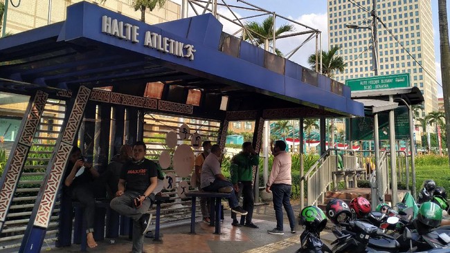 Pantauan detikcom, Senin (9/8/2021) pukul 15.15 WIB, halte tersebut tampak penuh oleh para pengemudi ojol. Mereka terlihat bersantai di sela-sela pekerjaan mengantarkan penumpang.