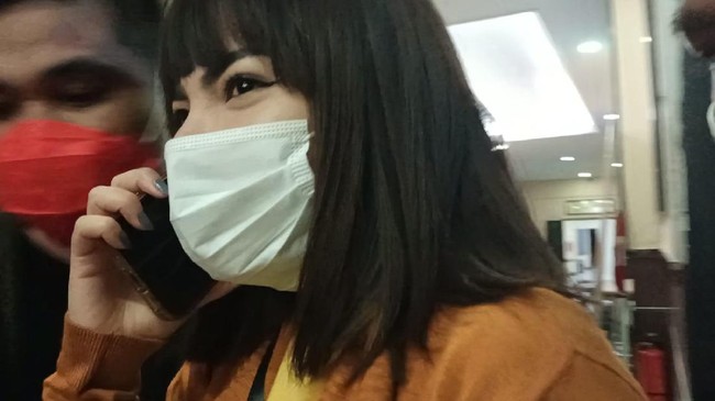 Dinar Candy menyambangi Polres Metro Jaksel pukul 18.55 WIB. Dia datang untuk wajib lapor.