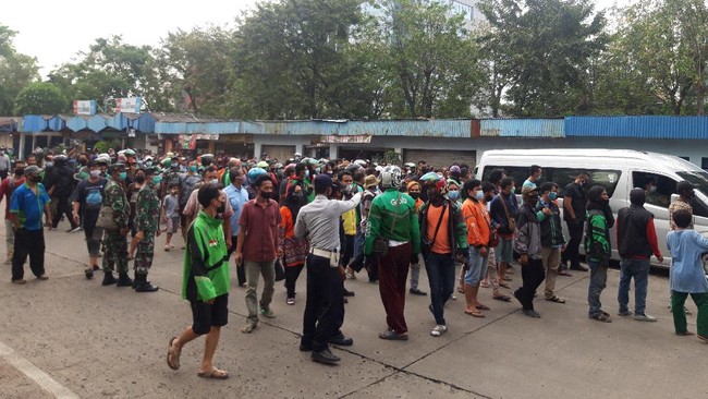 Kerumunan terjadi di lokasi hingga pukul 16.30 WIB. Tampak sejumlah warga 'balik kanan' dengan wajah murung karena tidak mendapat sembako.