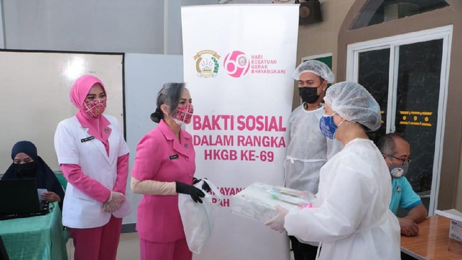 Bhayangkari juga turut mengajak warga untuk mau divaksinasi guna mencapai herd immunity.