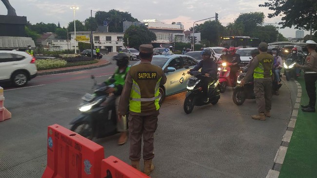Pantauan detikcom, Kamis (12/8/2021) sore, personel dari kepolisian, Satpol PP, dan Dishub tampak berjaga di kawasan Bundaran Senayan menuju Jl Sudirman. Mereka memantau mobil yang berpelat ganjil mengingat angka tanggal hari ini genap.