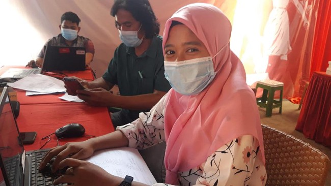 Salah satunya Aulia (20), yang bergerak cepat menyambut warga yang tiba di Gerai Vaksinasi Merdeka 286, Muara Angke, Jakarta Utara (Jakut). Bukan tanpa alasan Aulia senang saat ada warga yang datang untuk mengikuti vaksinasi COVID-19.