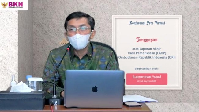 "Pernyataan kesimpulan ORI bahwa pada tahapan pelaksanaan asesmen tes wawasan kebangsaan BKN tidak kompeten melaksanakan asesmen TWK tersebut, terhadap pernyataan tersebut, BKN tentu menyampaikan keberatan," ujar Wakil Ketua BKN Supranawa Yusuf dalam konferensi persnya, Jumat (13/8/2021).
