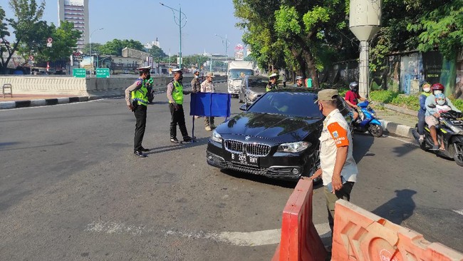 Peraturan ganjil-genap saat PPKM level 4 yang menggantikan penyekatan tetap berlaku di akhir pekan. Pengemudi mobil yang melanggar aturan tetap diputar balik.