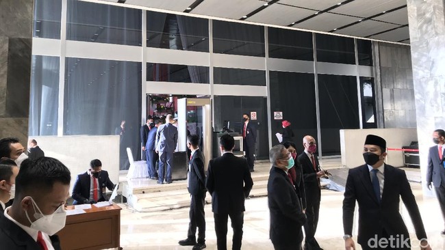Sejumlah tamu undangan Sidang Tahunan MPR, seperti kepala lembaga negara dan menteri kabinet, sudah mulai berdatangan. Mereka memasuki gedung Nusantara melalui pintu utama.
