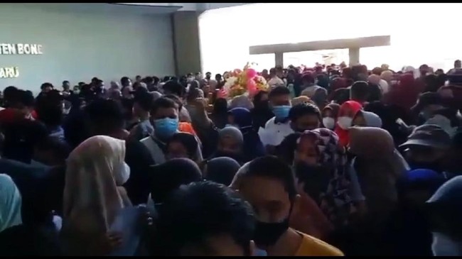 Viral di media sosial video kerumunan massa peserta vaksinasi di Rumah Sakit Umum Daerah (RSUD) Tenriwaru, Kabupaten Bone, Sulsel. Massa yang antre dalam ruangan tampak berdesakan dan tidak berjarak.