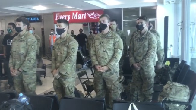 US Army atau tentara AS yang transit di Bandara Palembang sempat ikut sikap sempurna saat detik-detik Proklamasi, Selasa (17/8/2021). Juga ucapkan 'Selamat Hari Kemerdekaan Republik Indonesia'.