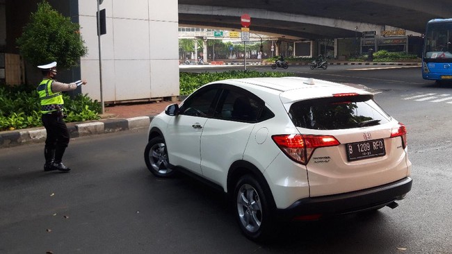 Mobil putih berpelat 'RFQ' tersebut langsung diberhentikan salah satu petugas kepolisian yang berjaga di area u-turn bawah flyover Jalan Gatot Subroto. Tidak ada penolakan dari sang pengemudi saat diminta berputar balik oleh polisi.
