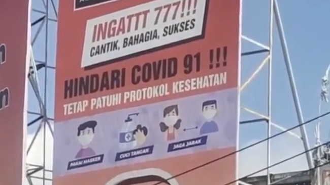 Sebuah baliho berukuran cukup besar terpampang di pinggir jalan di Kabupaten Tabanan, Bali, viral di media sosial. Baliho itu viral lantaran bertulisan 'Hindari COVID 91!!!'.