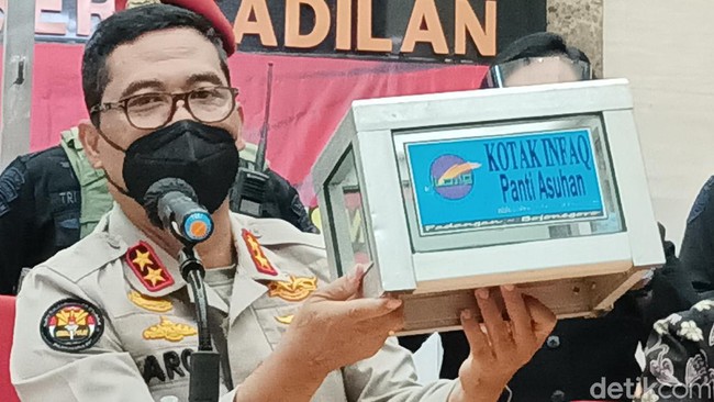 "Kemudian untuk tanda-tanda daripada infak contohnya seperti ini, ini ada tulisannya. Misalnya kotak infak panti asuhan saja, nggak ada nomor registrasi, nggak ada nomor izin juga tidak ada," kata Kadiv Humas Polri Irjen Argo Yuwono dalam konferensi pers di Bareskrim Polri, Jakarta Selatan, Jumat (20/8/2021).