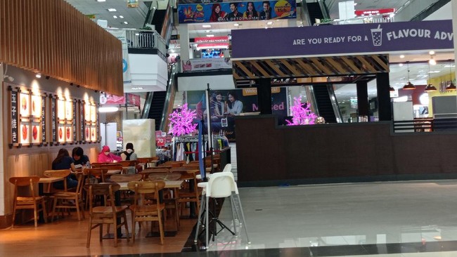 Gerai-gerai makanan di mal ini tampak sudah buka. Pembeli yang makan di tempat hanya terlihat beberapa orang saja. Gerai makanan dipenuhi pengemudi ojol yang membawa pesanan lewat aplikasi.