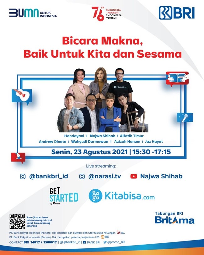BRI bersama Narasi dan Kitabisa.com menggelar program pengumpulan donasi 'Bisa Borong UMKM'. Program ini dilaksanakan sebagai bentuk dukungan BRI untuk UMKM Indonesia sekaligus dalam rangka memperingati HUT RI ke-76.