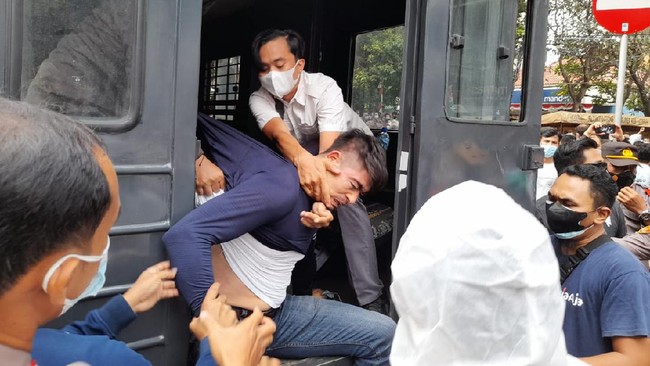 Pantauan di lokasi, Selasa (24/8/2021), pukul 10.15 WIB, petugas terlihat menarik seorang pria berbaju biru yang mencoba membantu temannya yang hendak dibawa petugas.