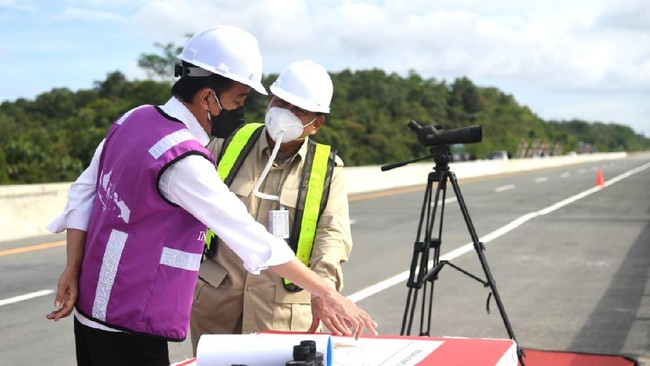 Presiden Joko Widodo (Jokowi) melanjutkan peninjauan proses pembangunan ibu kota negara baru di Kalimantan Timur (Kaltim). Kali ini Jokowi meninjau langsung sodetan aksen jalan menuju rencana ibu kota negara baru.